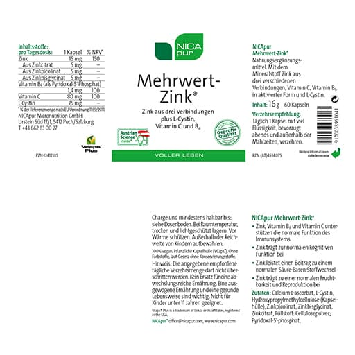 The mixture of 3 different organic zinc compounds is optimally absorbed and utilized by the body in combination with vitamin B6. Zinc contributes to normal acid-base metabolism and contributes to cognitive development. It is important for skin, hair and nails and, together with vitamin B6 and vitamin C, supports the immune system. Activated vitamin B6 positively supports the function of the nervous and immune systems. Perfectly rounded off with L-cystine.