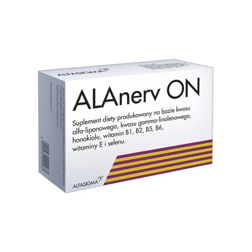 ALAnerv ON dietary supplement intended for use as a supplement to the daily diet with B vitamins, vitamin E, ALA, GLA, honokiol and selenium.