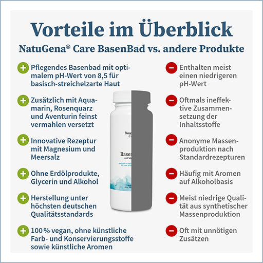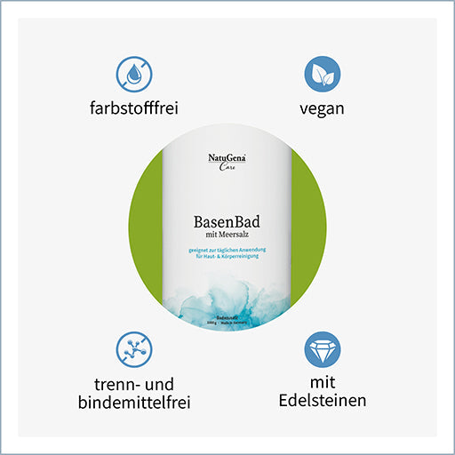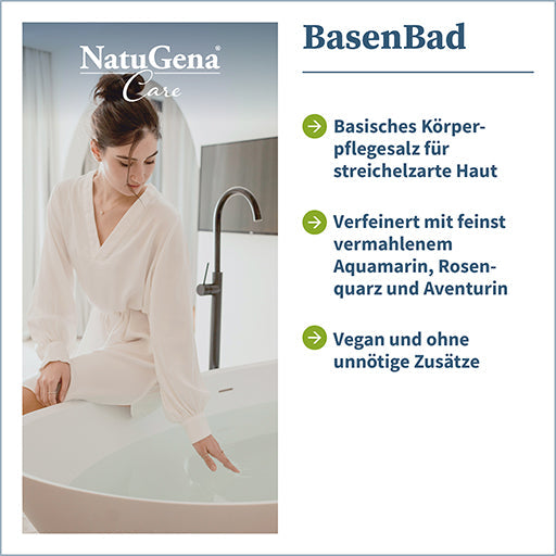 Alkaline body care salt for soft skin with 3 gemstones in the finest ground An alkaline bath can gently influence the acid-base balance of the human body and invigorate the skin. It can stimulate the skin to re-lubricate itself and gives it a pleasant suppleness. The NatuGenaCare BasenBad has a pH value of 8.5. Alkaline bath salt increases the so-called pH value in the water, which creates osmotic pressure. This means that the acids and toxins are increasingly released through the skin pores to the surface of the skin and can be neutralized. Me-time in the bath also allows you to relax, recharge your batteries and take care of your mental well-being. NatuGenaCare BasenBad also contains the three precious gemstones aquamarine, aventurine and rose quartz in the finest ground form. The combination of mineral salts, magnesium and the three precious, finely ground gemstones gives you a soothing and relaxing alkaline bath - for conscious and natural care with acid-base balance. NatuGenaCare BasenBad can be used in many different ways - the flexibility of the body care salt depends entirely on your individual needs.