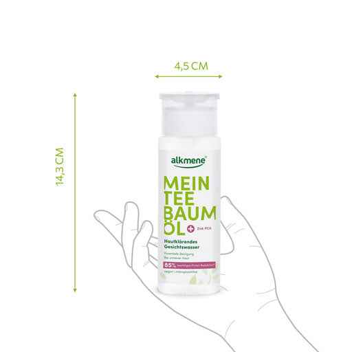 The alkmene MY TEA TREE OIL Skin-Clarifying Facial Toner, with its unique combination of tea tree oil and zinc PCA, purifies the skin and demonstrably reduces pimples, blackheads, and redness. The skin is gently cleansed and optimally prepared for subsequent care steps. For a deeply purified and refined complexion. Skin compatibility dermatologically approved. Non-comedogenic.