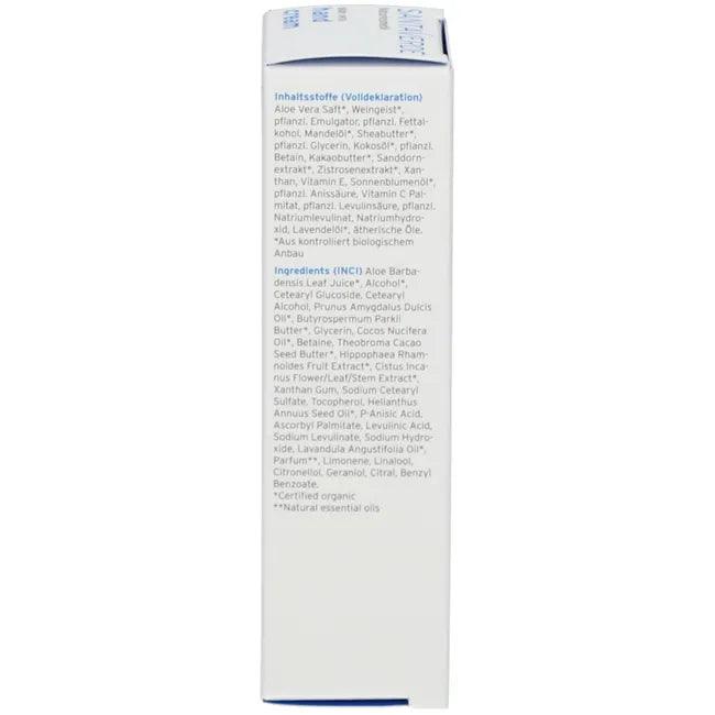 Aloe vera juice*, wine spirit*, vegetable. Emulsifier, vegetable Fatty alcohol, almond oil*, shea butter*, vegetable. Glycerin, coconut oil*, vegetable Betaine, cocoa butter*, sea buckthorn extract*, cistus extract*, xanthan gum, vitamin E, sunflower oil*, vegetable. Anisic acid, vitamin C palmitate, vegetable Levulinic acid, vegetable Sodium levulinate, sodium hydroxide, lavender oil*, essential oils.