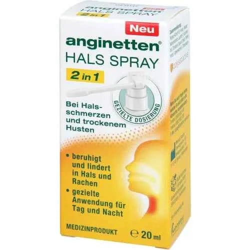 The anginetten® Throat Spray 2 in 1 is a medical device with a honey formula for soothing coughs and relieving sore throat symptoms. The spray forms a protective film in the throat, protecting the irritated mucous membrane and thus soothing coughs. The anginetten® Throat Spray 2 in 1 can be used by adults and children 3 years of age and older. The spray must be administered to children under adult supervision.