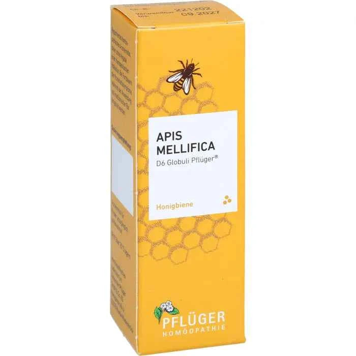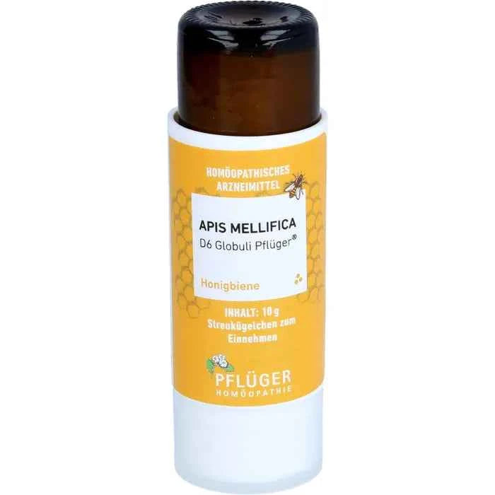 Apis mellifica D6 Globuli Pflüger®, Composition: 10 g of globules contain: Active ingredient: Apis mellifica Dil. D6 0.1 g. Other ingredient: Sucrose. Registered homeopathic medicinal product, therefore no therapeutic indication is specified. Contraindications/Side effects: None known. Contains sucrose. Consult the package insert. For risks and side effects, read the package insert and ask your doctor or pharmacist.
