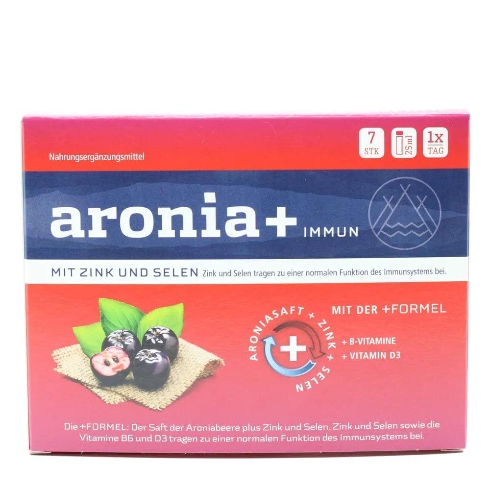 Our immune system is an endogenous protection to fight off pathogenic germs such as bacteria and viruses. In order for the immune system to function reliably, the organism must be supplied with vitamins and minerals daily through nutrition. If this is not possible in certain life situations or if there is an increased need for important micronutrients due to illness or the use of certain medications, the consumption of a food supplement can serve to support the immune system. With the trace elements zinc and selenium as well as vitamins B6 and D3, aronia+ IMMUN contains valuable minerals that contribute to the normal functioning of the body's immune system. In addition, zinc, selenium and vitamin B2 are involved in protecting the cells from oxidative stress. The dietary supplement with a tart-fruity taste is practical and easy to use on a daily basis thanks to the edible drinking ampoules. aronia+ IMMUN contains no artificial colors and is lactose- and gluten-free.
