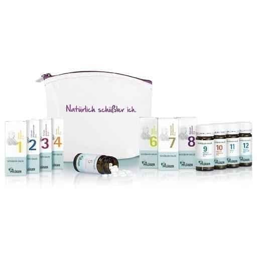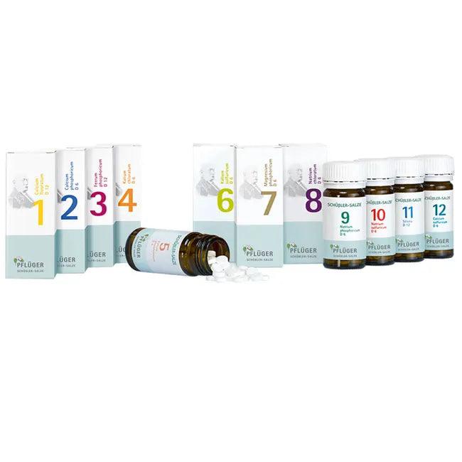 The medicine chest contains the Schuessler salts in tablet form from No. 1 to No. 12 in pack sizes of 100 pieces.