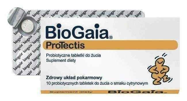 - In the form of BioGaia Probiotic chewable tablets containing a dose of 100 million live bacteria Lactobacillus reuteri Protectis, which help maintain a healthy balance of microflora of the digestive system.