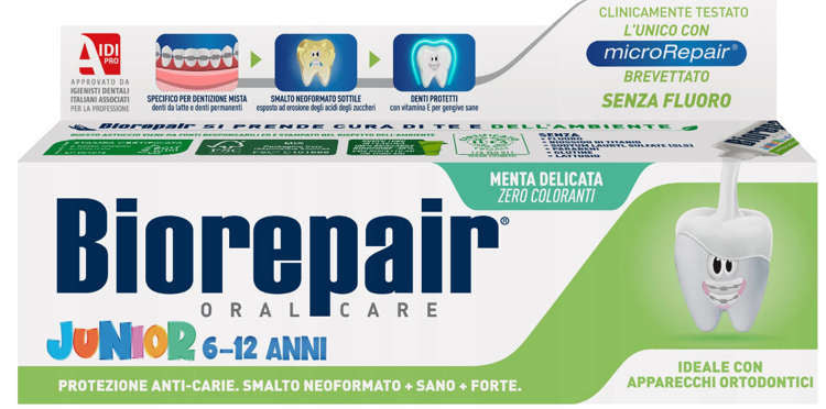 - BioRepair Junior. Refreshingly mint toothpaste BioRepair Junior 7-14 is a paste suitable for school-age kids. During this period, it is especially important to take care of oral hygiene, and the MicroRepair particles contained in the paste will do it very effectively.