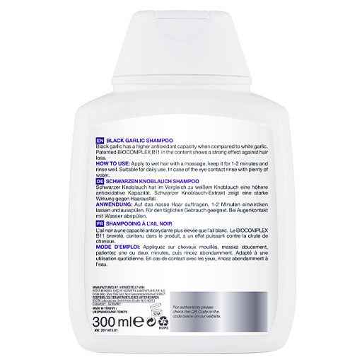 Bioxcin Black Garlic Shampoo contains 100% black garlic extract and offers comprehensive hair care. Black garlic strengthens the hair roots, nourishes the scalp, and supports healthier and stronger hair growth. Black garlic also adds volume, shine, and softness to the hair. Bioxcin Black Garlic Shampoo also contains other natural ingredients such as the herbal extract BiocomplexB11, bioactive peptides, and ivy extract. These components help prevent hair loss, contribute to thicker and fuller hair, and promote healthy hair growth.