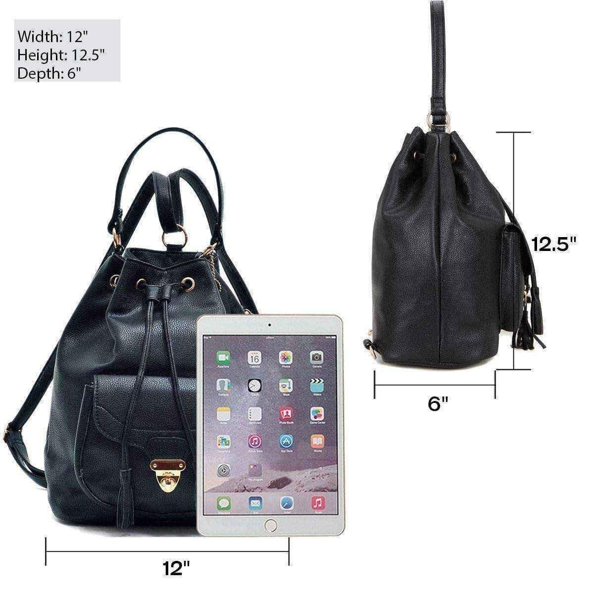 Handbag Material Faux Leather Handbag Color Purple Color Black, Blue, Brown, Pink, Purple, Red, Tan, White Main Closure Type Draw String Dimensions 12 inches wide x 12.5 inches high x 6 inches deep Model Number Black handbags Country of Origin China