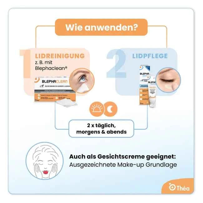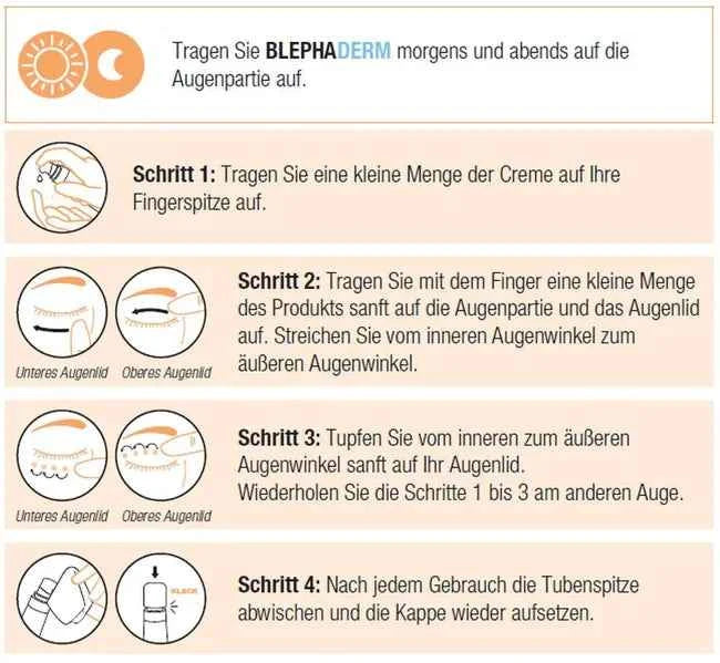 Blephaderm® is suitable for all skin types, especially sensitive, dry, irritated, and atopic-prone skin. The eyelid cream is also suitable for sensitive eyes and contact lens wearers. Blephaderm® has been tested under dermatological and ophthalmological supervision and has demonstrated excellent tolerability. This soothing cream can also be applied daily to the entire face. It has a pleasant, quickly absorbed texture, is non-sticky and non-greasy, and spreads easily, making it ideal as a makeup base.