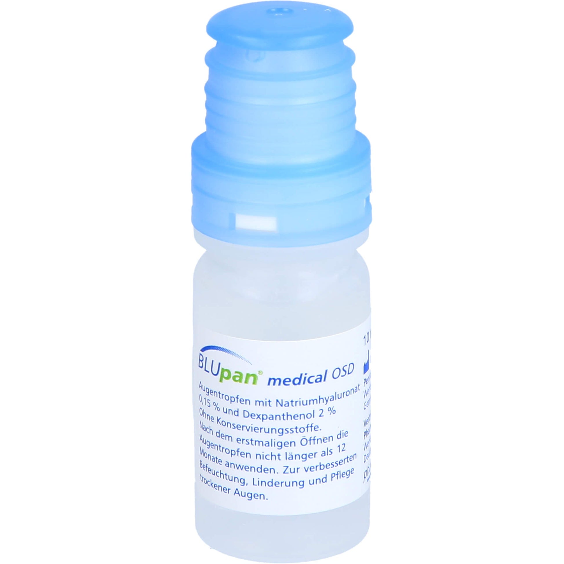 BLUpan medical OSD form a sterile, preservative-free, viscoelastic, clear protective film for the cornea. BLUpan medical OSD contain sodium hyaluronate, the sodium salt of hyaluronic acid, which, due to its special physical properties, forms an even, stable and particularly long-lasting protective film on the cornea without impairing vision. In addition, BLUpan medical OSD contains provitamin B5 (dexpanthenol), which, due to its high water-binding capacity, has the ability to moisten and care for the eye. This effectively supports the moisturizing properties of sodium hyaluronate. The combination of sodium hyaluronate (stabilizes the tear film) and dexpanthenol (nourishing, soothing) protects and moisturizes the surface of the eye and makes it lubricated. It therefore provides long-lasting relief from symptoms associated with: