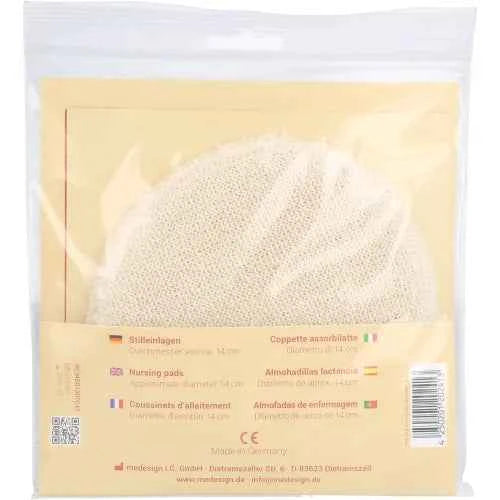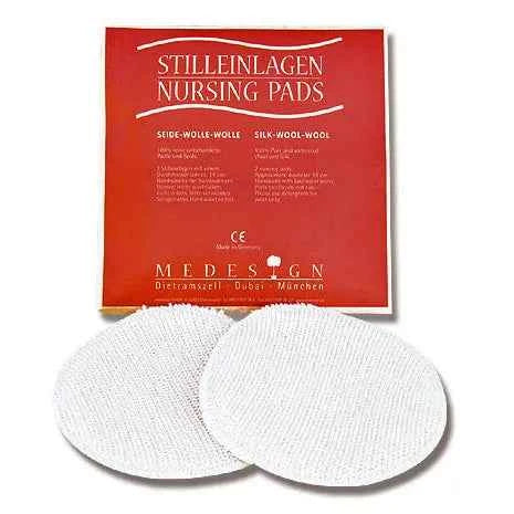 2 nursing pads with a diameter of approximately 14 cm. Simply hand wash with lukewarm water; do not rub vigorously, but squeeze gently. Please use a suitable wool detergent.