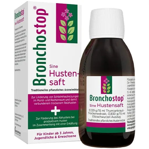 Bronchostop ® Sine cough syrup is a traditional herbal medicine used to relieve irritation of the mucous membranes in the mouth and throat and the associated dry, irritating cough, as well as to promote coughing in the case of productive coughs associated with a cold. The medicine is a traditional medicine that is registered for this area of application solely on the basis of many years of use.