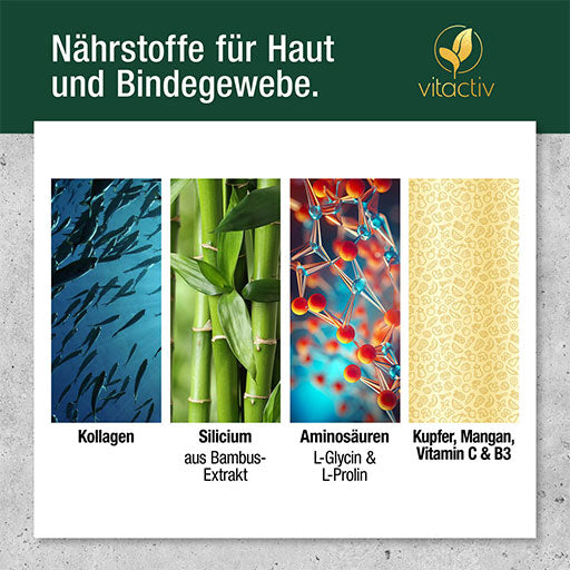 collagen hydrolysate (fish); coating agent: hydroxypropylmethylcellulose (vegetable capsule shell); filler: microcrystalline cellulose; L-glycine; bamboo extract (Bambusa arundinacea) with 70% silicon; L-proline; L-ascorbic acid (vitamin C); L-leucine; nicotinic acid (niacin - vitamin B3); selenomethionine; manganese citrate; copper gluconate.