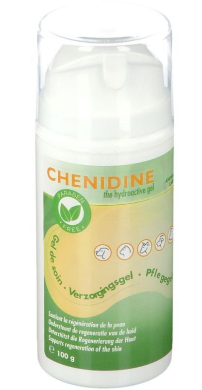Chenidine is a gel that supports the healing of all types of skin damage caused by injury, licking, excessive use (for example, nipples after feeding) when