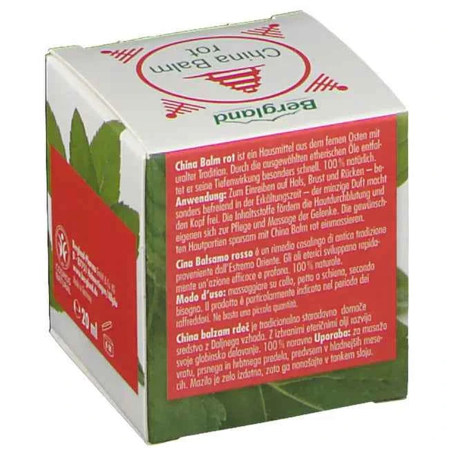 For rubbing on the neck, chest, and back – especially liberating during cold season. The minty scent clears the head. The ingredients promote skin circulation and are suitable for caring for and massaging joints. Massage the desired skin areas sparingly with China Balm red.