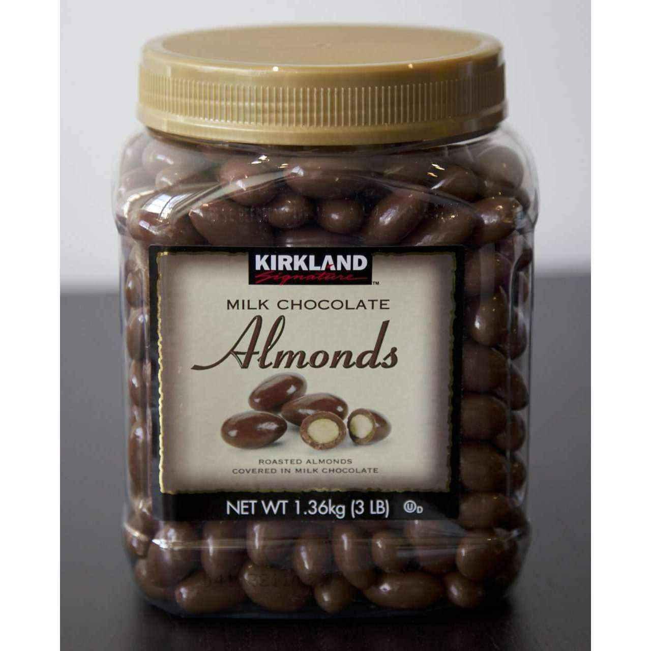 Chocolate covered almonds | 1.36 kg. Kirkland Signature's Milk Chocolate Almonds are made using the finest dry roasted almonds, generously coated in a deliciously satisfying milk chocolate. These chocolatey and nutty treats are bound to satisfy your tastebuds!