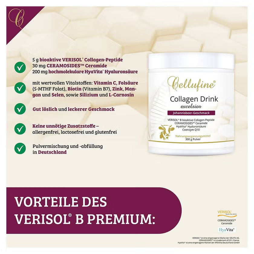 Recommended intake: Drink 1 serving of Cellufine® VERISOL ® B Collagen Drink EXCELSIOR Blackcurrant once daily. We recommend drinking at least 2 liters of water per day as well.