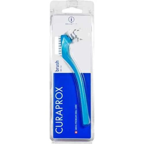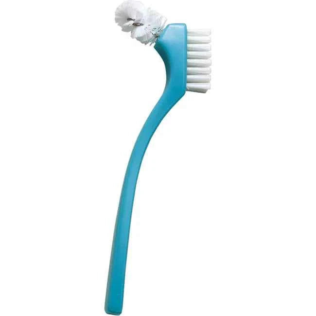 The patented denture brush leaves no chance for bacterial deposits and dirt. The two sets of bristles clean all areas perfectly.
