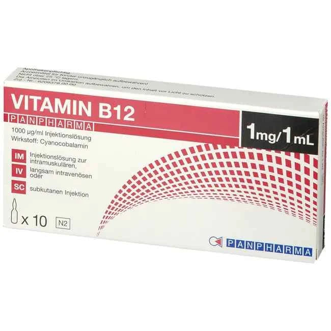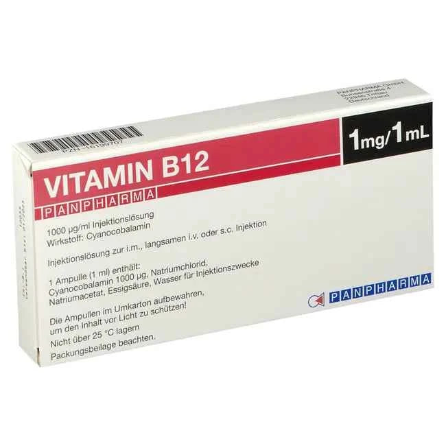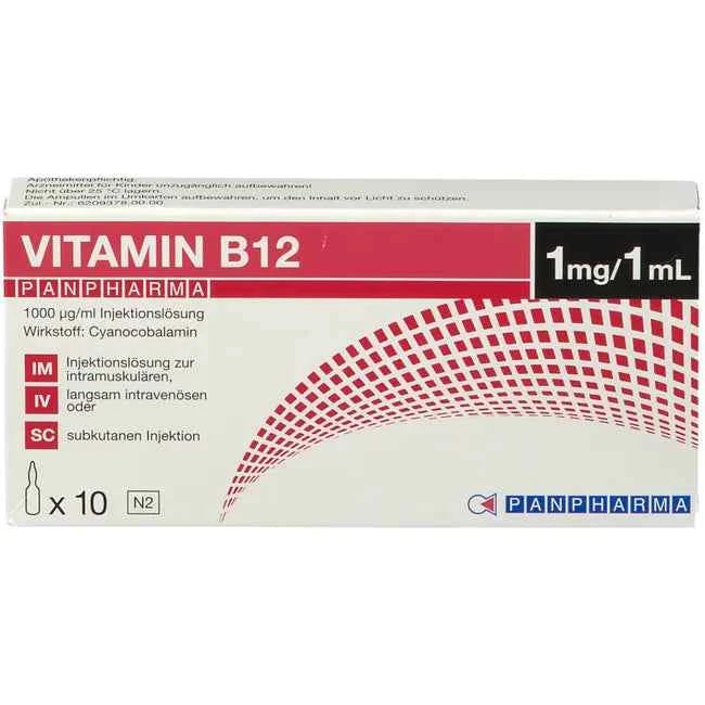 Vitamin B12 Panpharma 1000 µg/ml Injection Solution. Active ingredient: cyanocobalamin. Indications: For vitamin B12 deficiency, with blood disorders and anemia, and/or disorders of the nervous system, such as spinal cord damage.