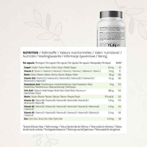 Beautiful skin, hair and nails are part of a well-groomed appearance. However, a lack of nutrients can quickly lead to brittle nails, a pale complexion and lifeless hair or even hair loss. The combination of 11 selected vitamins, minerals and trace elements helps maintain beautiful skin, hair and nails. The combination of vitamins C, B1, B2, niacin, pantothenic acid, vitamins B6, B12, folic acid, biotin, copper and zinc ensures radiant skin, strong nails and strong hair. Vitamin C supports normal collagen formation in the skin and, in combination with B2, copper and zinc, protects against oxidative stress. Copper also contributes to cell division, the maintenance of connective tissue and skin and hair pigmentation. Vitamins C, B1, B2, B3, B5, B6, B12, biotin and copper also contribute to normal energy metabolism.