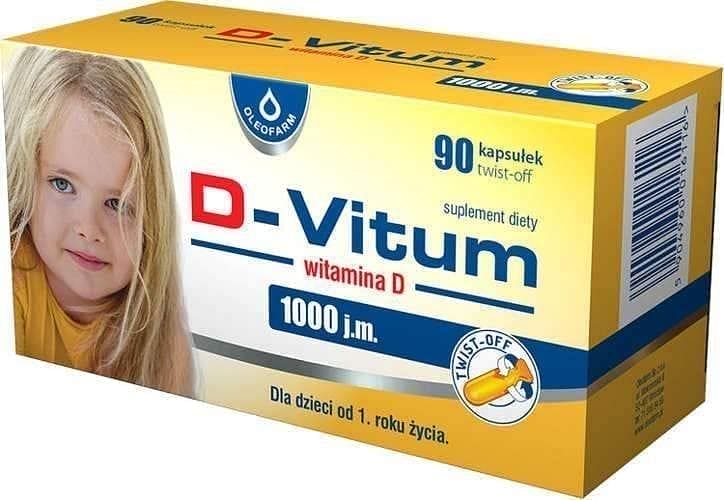 Dietary supplement D-Vitum vitamin D 1000 IU is in the form of twist-off capsules and is recommended for children from 1 year of age. The preparation supplements the daily diet with vitamin D, an ingredient supporting the proper development and growth of bones in children.