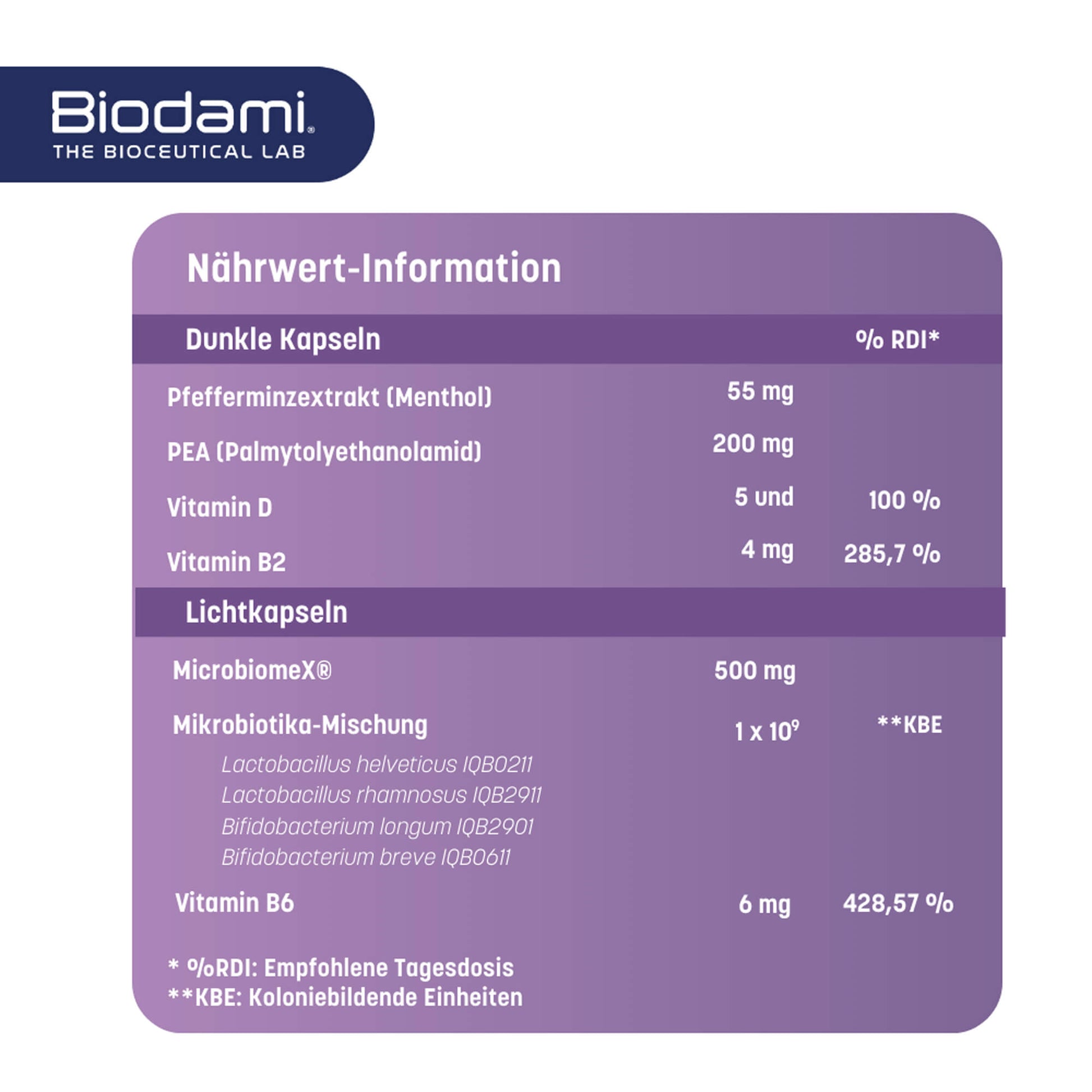 - Beige capsules (1 capsule): Microbiomex® [Citrus extracts (Citrus sinensis, fruit, 470 mg); (Citrus paradisi, fruit, 30 mg), glazing agent (hydroxypropylmethylcellulose), olive oil (Olea europaea, fruit, 80 mg), nettle extract (Urtica dioica, leaf, 50 mg), potato starch, anti-caking agents (calcium phosphate, silicon dioxide, magnesium salts of fatty acids, talc, lecithin), microbiotic strains 1 billion CFU** (Lactobacillus helveticus IQB0211, Lactobacillus plantarum IQB8386, Lactobacillus rhamnosus IQB2911, Bifidobacterium longum IQB2901), pyridoxal-5-phosphate (vitamin B6, 6 mg, 428.57% RDI*).