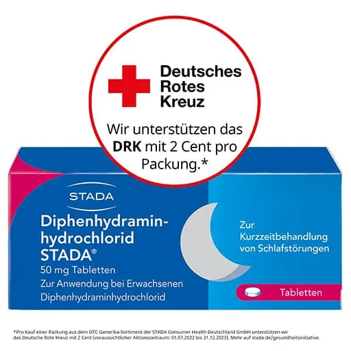 Diphenhydramine hydrochloride STADA® is a sleep-promoting active ingredient that has proven effective in the short-term treatment of sleep disorders. The product reliably helps you fall asleep faster and sleep through the night better, so that the user can start the day feeling refreshed after getting enough sleep.