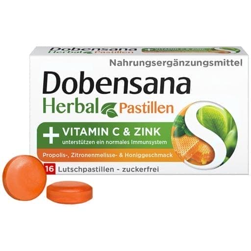 Dobensana Herbal Propolis, Lemon Balm & Honey Flavor Lozenges contain natural propolis extract and lemon balm oil. The combination of valuable herbal oil and natural extracts give the Dobensana Herbal lozenges their unmistakable taste. The essential nutrients vitamin C & zinc support a normal immune system. Dobensana Herbal Pastilles are sugar free, fructose free, gluten free and lactose free. In addition, the Dobensana Herbal Pastilles are vegetarian.