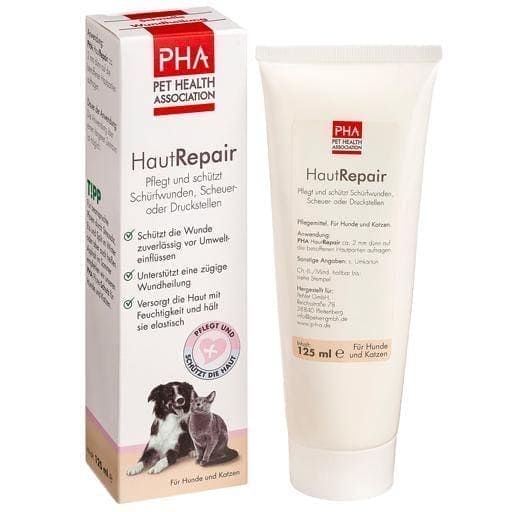 chafing or pressure points. PHA HautRepair is a covering and well-tolerated skin ointment with panthenol, zinc oxide and cod liver oil. PHA HautRepair cares for and protects stressed skin and is suitable for dogs and cats as well as horses. It reliably protects the wound from environmental influences and supports rapid wound healing. The ointment also provides the skin with moisture and keeps it elastic, which is important for healthy scarring.
