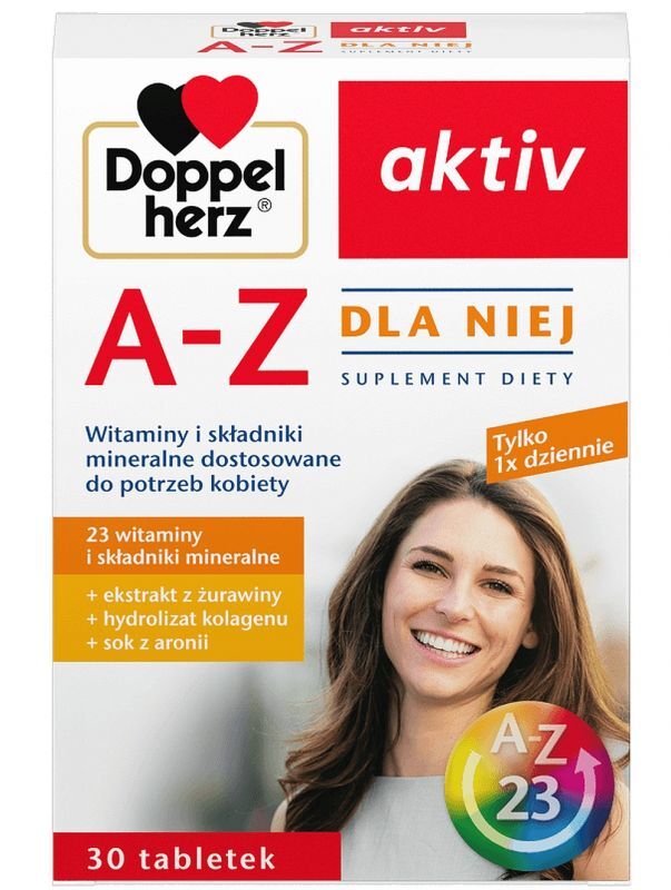 - Doppelherz aktiv tablets are recommended to use to supplement the daily diet with important vitamins, minerals and valuable substances derived from plant extracts. Dietary supplement Doppelherz Aktiv AZ For Her contains, among others iron, cranberry and aronia.