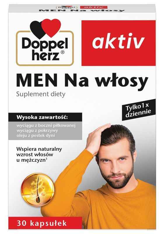 Supports natural hair growth in men. Doppelherz® aktiv MEN Hair dietary supplement contains carefully selected ingredients that help maintain healthy and strong hair (serrated palmetto, nettle, zinc, selenium).