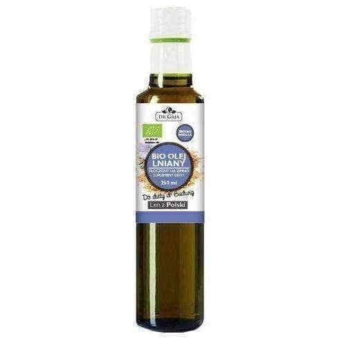Dietary supplement Dr Gaja Bio Unrefined flaxseed oil for use in supplementing the daily diet with essential fatty acids. For cold use only.
