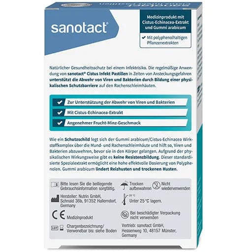 The sanotact ® Cistus Infekt pastilles have a very special effect with their ingredients gum arabic/cistus-echinacea. The active complex forms a protective shield over the mucous membranes of the mouth and throat. This barrier supports the physical defense against viruses and bacteria and thus prevents them from penetrating the body's cells. The further proliferation of harmful organisms is thus prevented and the development of an illness is prevented. In addition, dry coughs and irritating coughs are alleviated by gum arabic. The pastilles can therefore be used as soon as the throat starts to scratch, rather than just for acute problems.