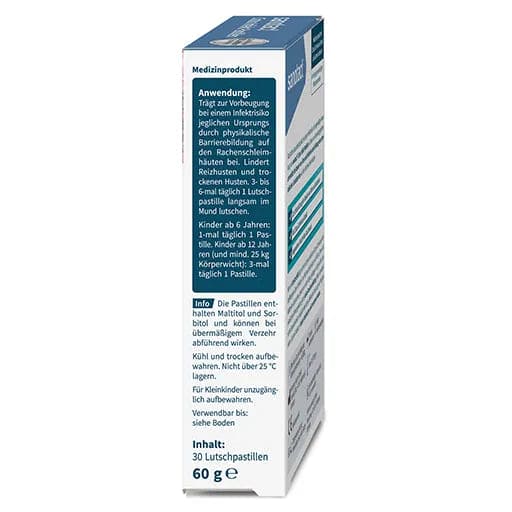 If there is no improvement 2-3 days after starting treatment or if the symptoms have worsened considerably (e.g. if a fever of 38°C or higher occurs), please consult a doctor. The lozenges contain malitol and sorbitol and can have a laxative effect if consumed in excess. Keep out of reach of small children.