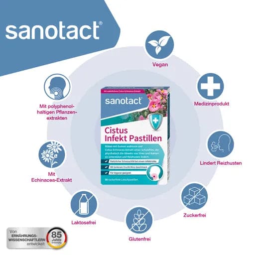sanotact ® Cistus Infection Pastilles - The natural protective shield for increased risk of infection. Sugar-free lozenges with Cistus and Echinacea extract.