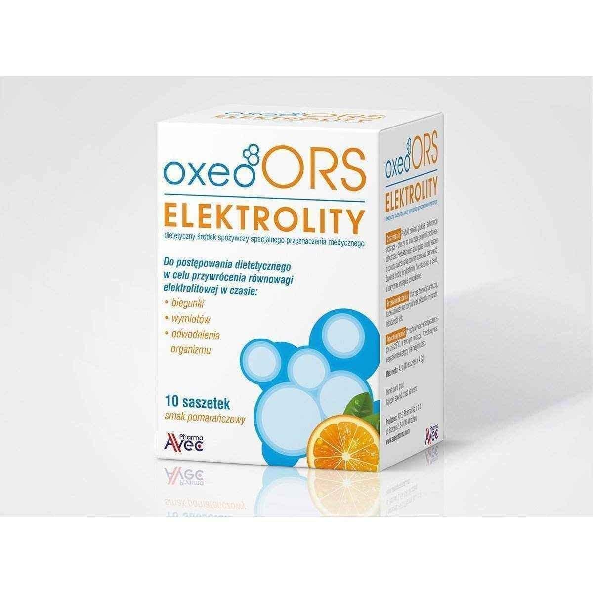 Oxeo ORS electrolytes is a dietary food for special medical purposes, which helps to restore the water and electrolyte balance. Oxeo ORS electrolytes is a powder for preparing the drink with orange flavor containing glucose, sodium, potassium, chloride and citrate. It has an osmolality 245mOsm / l.