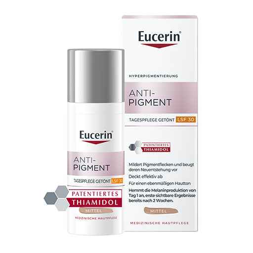 Gentle cleansing for daily use for all skin types: Thoroughly cleanse the face with Eucerin Anti-Pigment Cleansing Gel. Apply Eucerin Anti-Pigment Day Cream SPF 30 Tinted Medium every morning to the face, neck and décolleté and massage in gently, avoiding direct contact with the eyes. For best results, complement with Anti-Pigment Dual Serum. For an instantly fresh and awake appearance and long-term reduction of dark circles, also use Eucerin Anti-Pigment Dark Circle Correcting Eye Cream. Apply products containing Thiamidol ® to your face no more than four times a day .