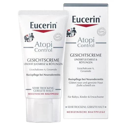 Eucerin AtopiControl Face Cream is a light facial care product for dry, cracked skin and is suitable for treatment during symptom-free phases of atopic dermatitis. Eucerin AtopiControl Acute Care Cream should be used in acute phases of atopic dermatitis. The active ingredients it contains, such as omega-6 fatty acids and licochalcone A, have a calming effect and smooth the facial skin. Itching and redness are also alleviated. Its suitability during atopic phases and for use on children and babies has been dermatologically confirmed. Since the skin care product does not contain any fragrances, the risk of skin irritations and allergies is very low. The skin care product is quickly absorbed and is also very suitable as a make-up base/primer.