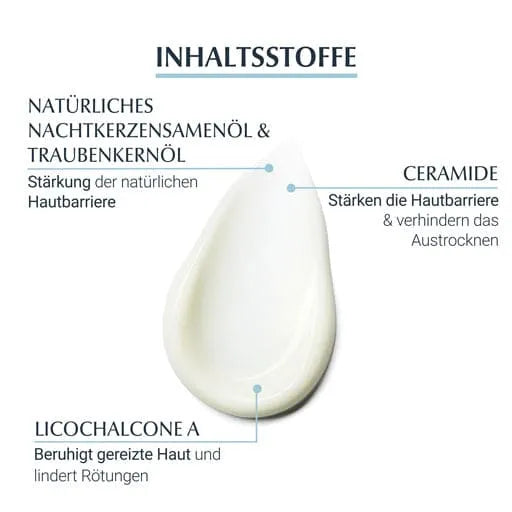 Aqua, Glycerin, Vitis Vinifera Seed Oil, Oenothera Biennis Oil, Caprylic/Capric Triglyceride, Cyclomethicone, Dimethicone, Pentaerythrityl Tetraisostearate, Triisostearin, Cetyl Alcohol, Glyceryl Stearate, PEG-40 Stearate, Glycyrrhiza Inflata Root Extract, Ceramid-3, Tocopherol, Citric Acid, Sodium Citrate, Ascorbyl Palmitate, BHT, 1,2-Hexanediol, Phenoxyethanol, Piroctone Olamine