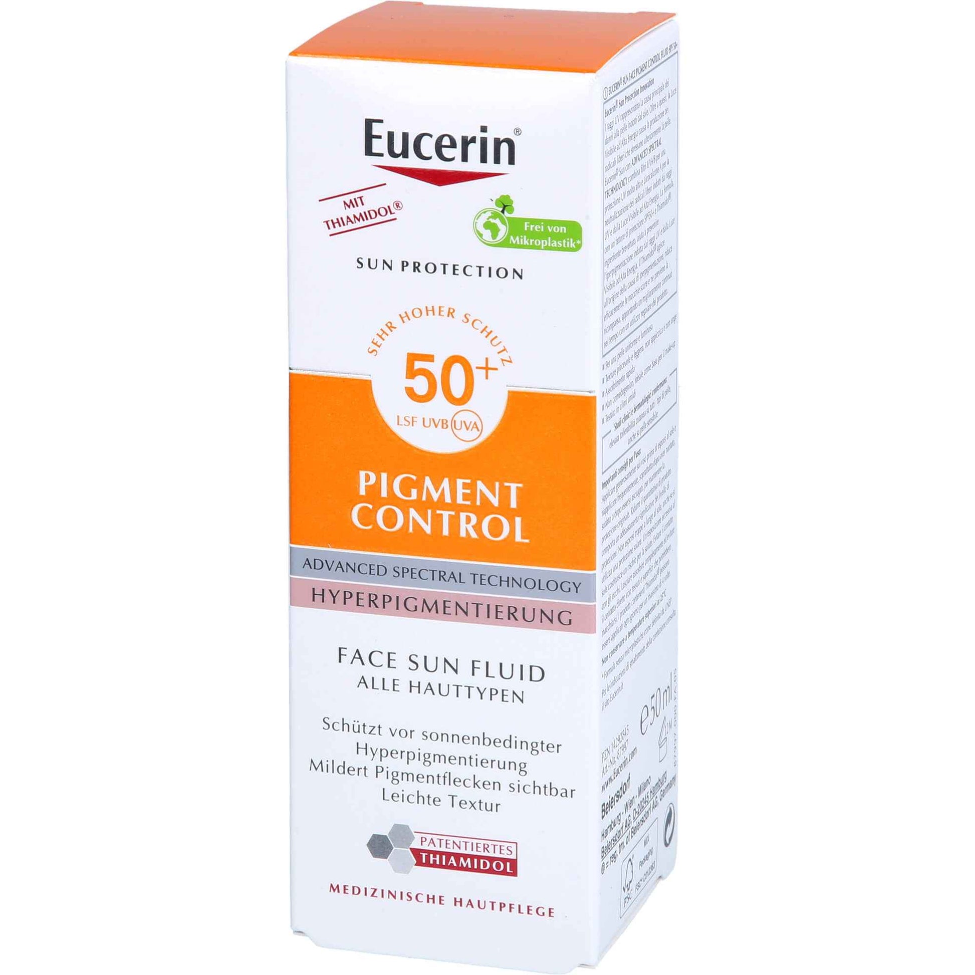 Eucerin Pigment Control Sun Fluid SPF 50+ helps prevent sun-induced hyperpigmentation and is suitable for daily use on all skin types.