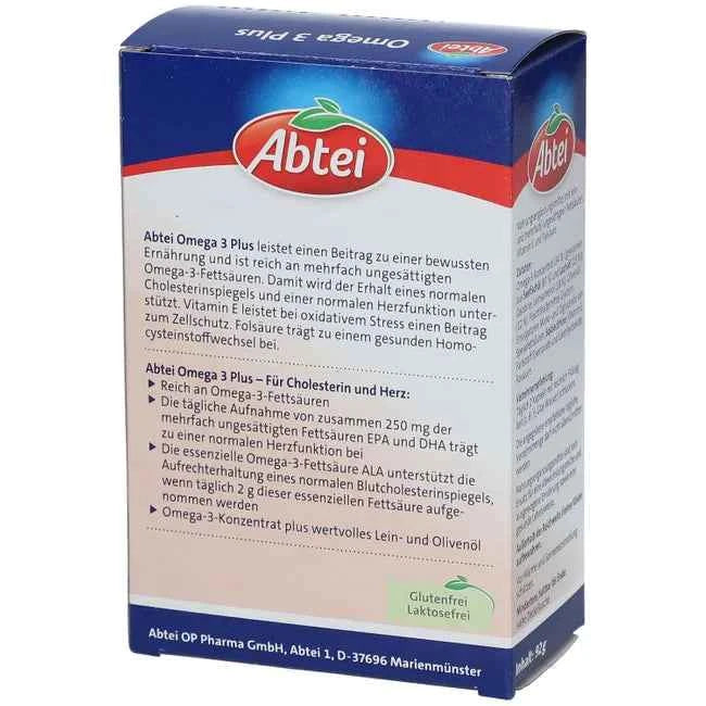 Abtei Omega 3 Plus contributes to a healthy diet and is rich in unsaturated fatty acids. The capsules contain valuable omega-3, 6, and 9 fatty acids. This supports the maintenance of normal cholesterol levels and normal heart function. Vitamin E contributes to cell protection against oxidative stress, while folic acid contributes to healthy homocysteine metabolism.