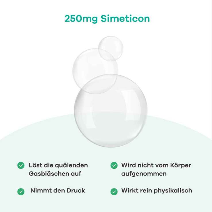 When gas accumulates in the abdomen, it becomes foam due to intestinal movement. This foam presses against the intestinal wall from the inside. The unpleasant consequences are bloating, a feeling of fullness, and abdominal pain. Simethicone reliably breaks down this distressing foam and relieves the discomfort.