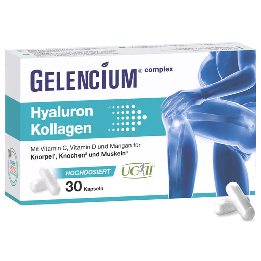 GELENCIUM® Hyaluron Collagen is a modern, high-dose complex preparation from the leading osteoarthritis pharmacy brand GELENCIUM®. For the first time, it combines the natural joint building blocks hyaluronic acid and collagen with specially selected micronutrients for joint health. The use of study-based branded raw materials (GREENIURONIC® & UC-II®) ensures excellent bioavailability. This means that the joints can be supplied with just 1 capsule a day. The optimally coordinated micronutrients vitamin C, vitamin D and manganese also support joint health (cartilage2, bones3, muscles4, connective tissue5). The use of unnecessary additives is completely avoided, making GELENCIUM® Hyaluron Collagen ideal for long-term use.