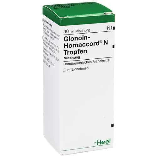 Based on the individual homoeopathic constituents of Glonoin-Homaccord, therapeutic possibilities result for the treatment of tachycardia, particularly of hyperthyroidism, anginal disorders with radiating pain (in the arm, breast, abdomen and neck). In these cases Glonoin-Homaccord acts, in addition to Cralonin, Cardiacum-Heel (as massive initial-dose therapy for disorders) and Aurumheel N drops (for signs of slight decompensation), not only symptomatically but also, with long administration, to provide a lasting cure. Glonoin-Homaccord can also be used harmlessly for a fairly long time. In glaucoma as auxiliary remedy, in plethora and polycythaemia in addition to Nux vomica-Homaccord and possibly Melilotus-Homaccord. The dosage is adjusted according to the disease, the symptoms and the stage of the illness: in acute disorders 5-10 drops every 10-15 minutes until improvement, possibly alternating with the above- mentioned preparations. For long-term therapy, 10 drops 3 times daily. 1 ampoule i.v. for an attack in sporadic disorders, otherwise 1 ampoule i.m., s.c., i.v. 1-3 times weekly, possibly with Cralonin, Angio-Injeel, Tabacum-Injeel, Aconitum-Injeel S, Carbo vegetabilis-Injeel, is rapidly effective, possibly also after myocardial infarction, together with Traumeel S, Carbo compositum, Strophanthus compositum, etc.
