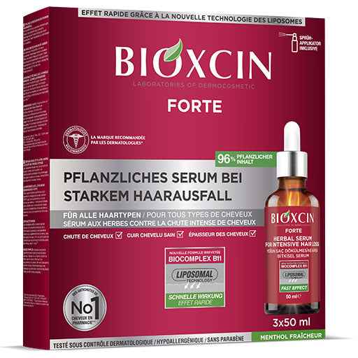 BioxcinForte Serum is a specially developed product for people suffering from intensive hair loss or who want to protect their hair. With its plant-based formula BioComplexB11, BIOXCIN Serum strengthens the hair roots, moisturizes the scalp, and supports healthy and strong hair growth. Furthermore, the active ingredients enriched with liposome technology penetrate the hair roots more effectively, helping to prevent hair loss faster. Strengthens weak hair follicles for healthier hair growth by up to 93%. Thickens hair strands and provides volume and resilience by up to 83%. It is 96% plant-based, dermatologically tested, and contains no parabens. It is also hypoallergenic.