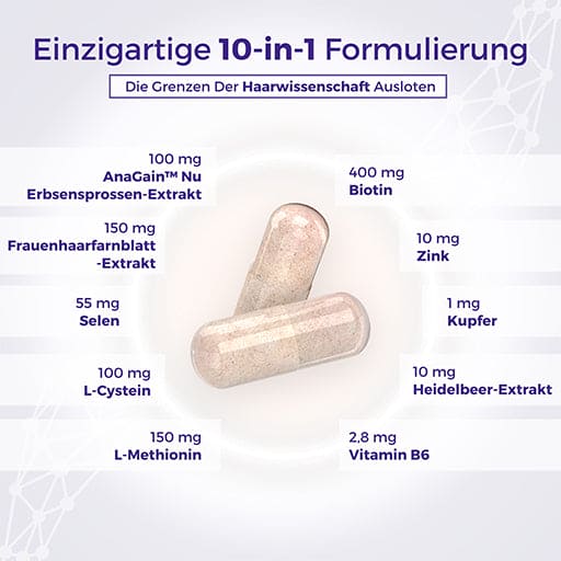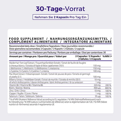 Filler gum arabic, maidenhair fern (Adiantum Capillus Veneris), L-methionine, L-cysteine hydrochloride, pea shoot (Pisum sativum), coating agent hydroxypropylmethylcellulose (capsule shell), zinc bisglycinate, anti-caking agent cellulose, L-selenomethionine, blueberry fruit extract (Vaccinium myrtillus), pyridoxal-5'-phosphate monohydrate, copper citrate, D-biotin.