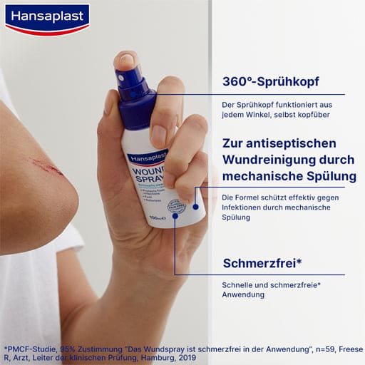 The Hansaplast wound spray offers optimal wound care for acute wounds, such as cuts and abrasions, smaller 1st and 2nd degree burns and open blisters. For antiseptic wound cleaning by mechanical irrigation. Cleaning with the wound spray is painless*. The spray can also be used to moisten sticky or encrusted bandages for easy removal. Post-operative and chronic wounds can also be treated with Hansaplast wound spray as directed by a doctor. The alcohol-free wound spray does not dry out the skin, making it ideal for sensitive skin and children. In addition, the spray can be used in any position using the 360° spray head. In addition, the wound management spray is colorless and leaves no residue on the skin or clothing. For the home and when traveling: For optimal wound cleaning, the spray should not be missing in any first aid kit or travel first aid kit.