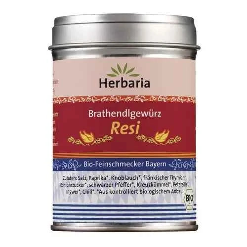 Herbaria Resi is an organic spice blend for Bavarian poultry dishes, whether baked, grilled, or pan-fried. It's also perfect for seasoning vegetarian or vegan dishes made with soy schnitzel or tofu. Classic ingredients like paprika and parsley, elegantly blended with lemon thyme, cumin, and ginger, give the spice blend a wonderful flavor of fruity paprika and herbs, along with a mild spiciness.