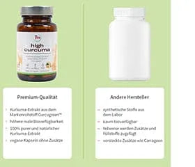 for you Turmeric capsules contain the high-quality and patented active ingredient Curcugreen ™. The ingredients for our turmeric capsules are vegan and lactose-free. This means that for you high curcuma is also suitable for people with lactose intolerance and for a vegan diet. The for you turmeric capsules are free of heavy metals and are GMO-free.